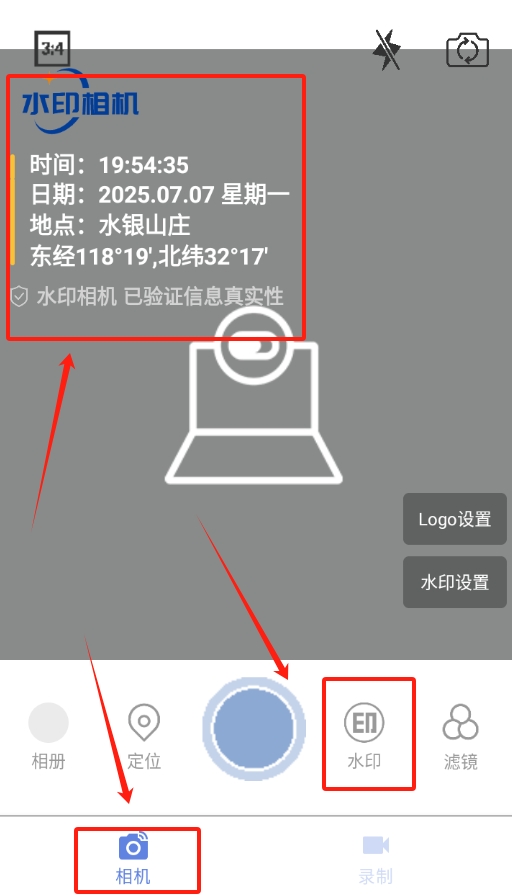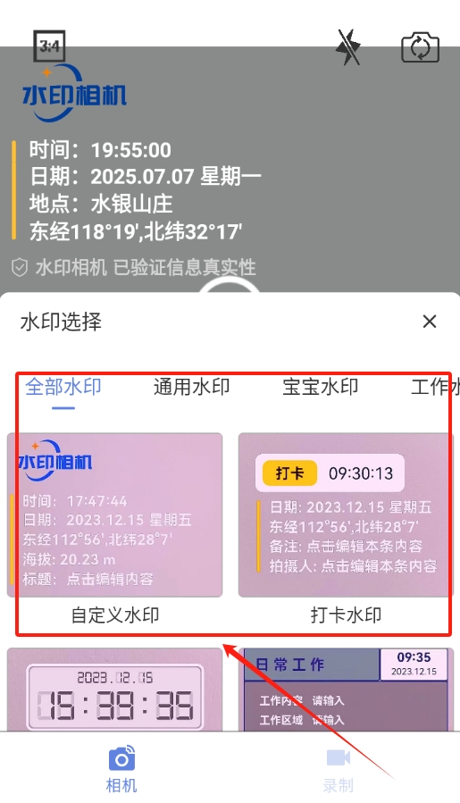 2、进入相机后会看到自带的水印,要是觉得不合适,直接点击水印就能切换其他样式。