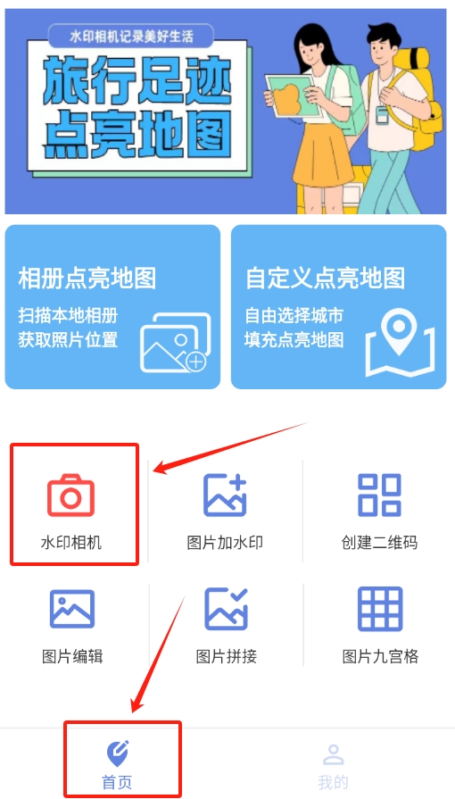 1、打开点亮地图,在首页找到水印相机的图标,点一下就能进入相机拍摄界面。