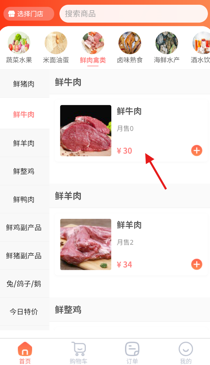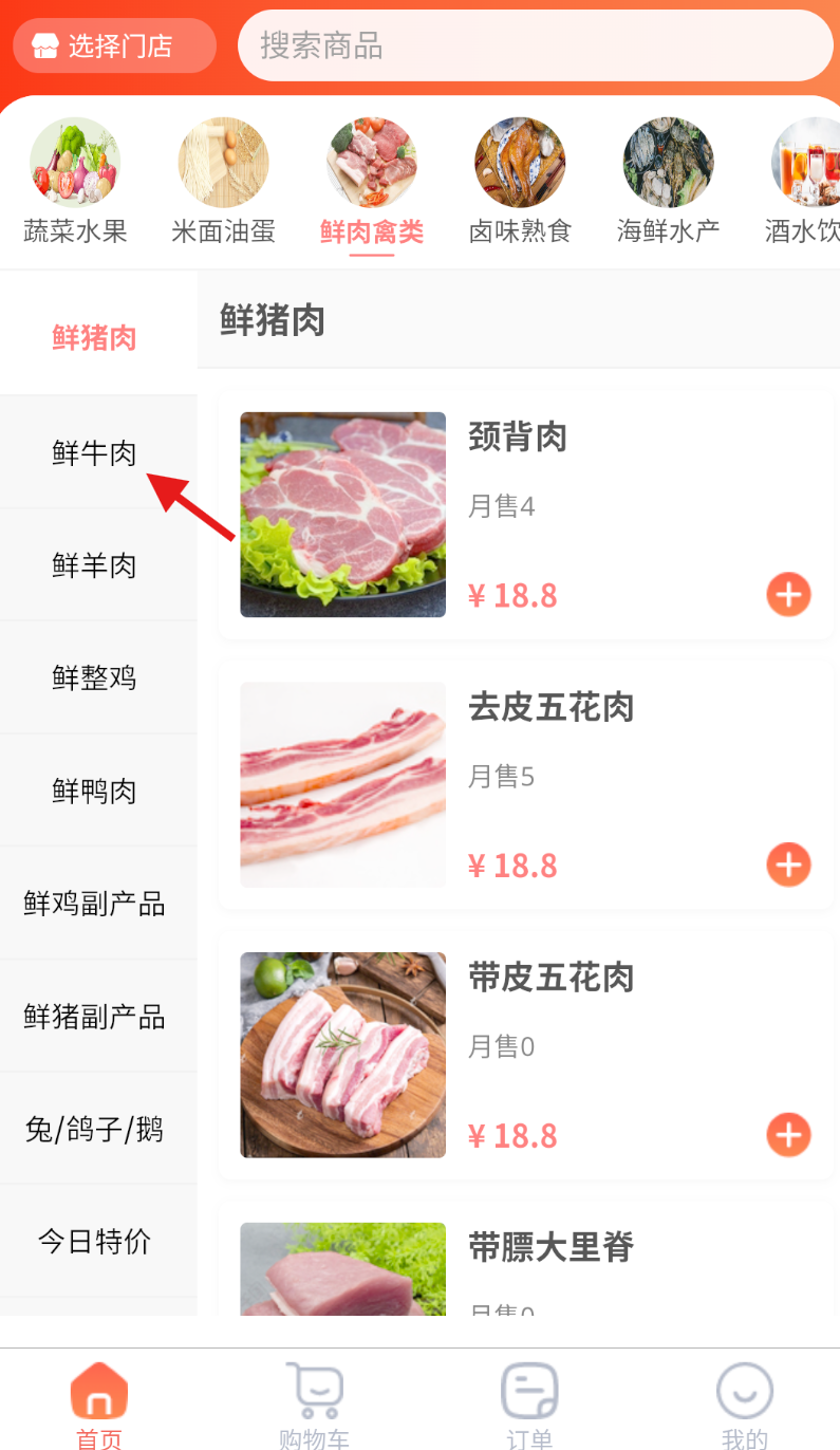 2、在鲜肉禽类页面中,浏览展示的商品,找到 “鲜牛肉” 并点击,进入鲜牛肉的商品列表。