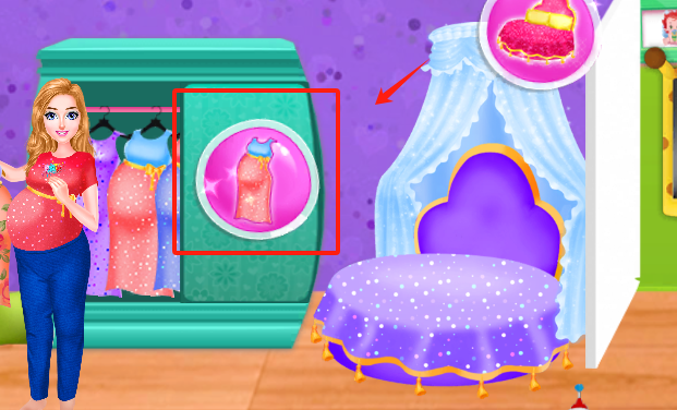2、看到衣柜门上粉色圆圈框出的裙子,点这个被标记的裙子,就能给金发孕妇换上这件漂亮衣服哟。