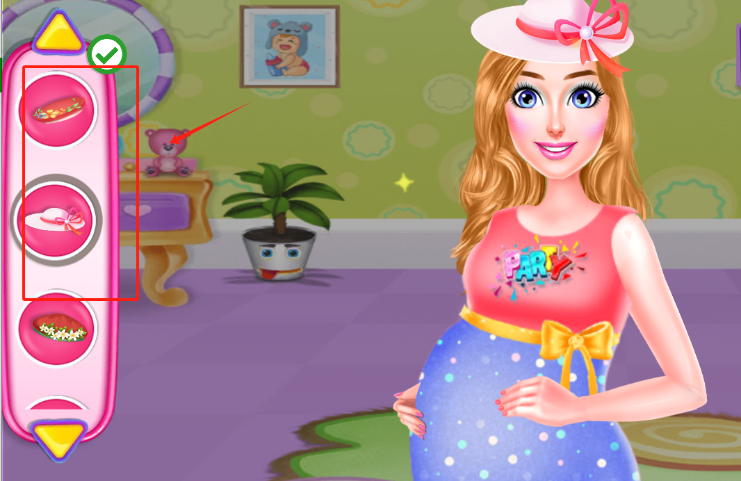 3、看到粉色选择栏里红框框住的物品,点这个带对勾的选项,就能帮孕妇选中派对装扮啦。