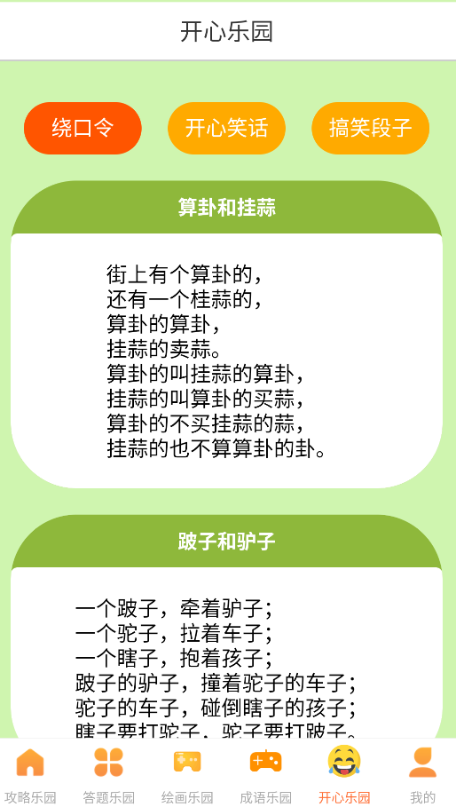 3、"开心乐园"提供轻松娱乐内容,包括经典绕口令、幽默笑话和网络热门段子,让您随时开怀一笑。