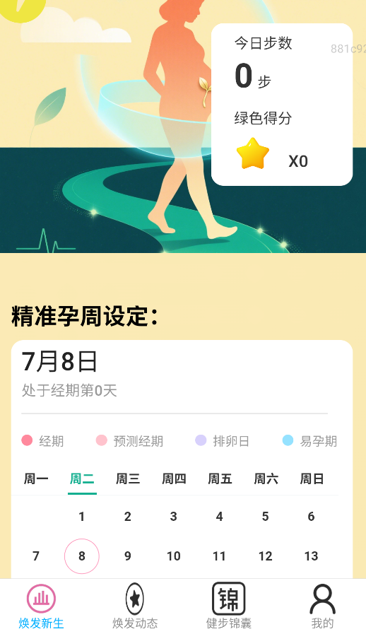 1、打开应用后,在首页"焕发新生"板块可实时追踪当日步数,还能设置个性化孕周数据监测。