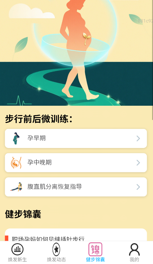 3、通过"健步锦囊"获取专业指导,包括步行前后热身运动、孕期各阶段训练方案及产后恢复教程。