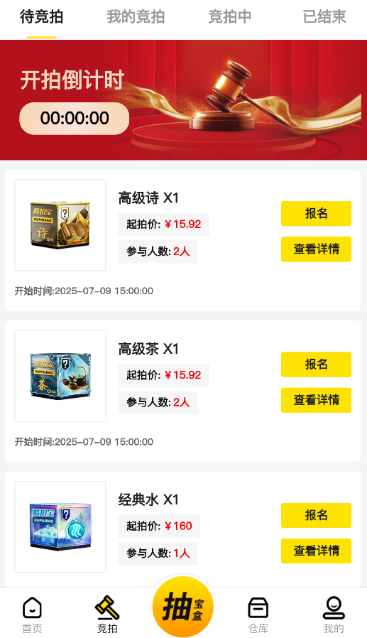 2、进入竞拍专区,可查看不同状态的拍卖商品(待开始、进行中、已结束),选择心仪商品参与竞拍。