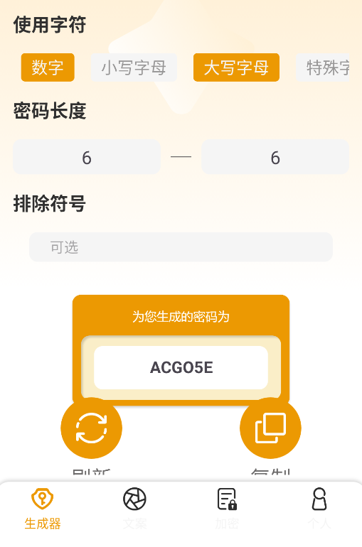 1、打开应用后,在"密码生成"界面可自定义字符类型、长度及排除符号,一键生成高强度密码。