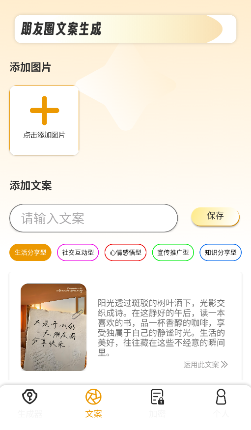 2、进入"文案创作"功能,上传图片并输入关键词,系统自动生成优质朋友圈文案。