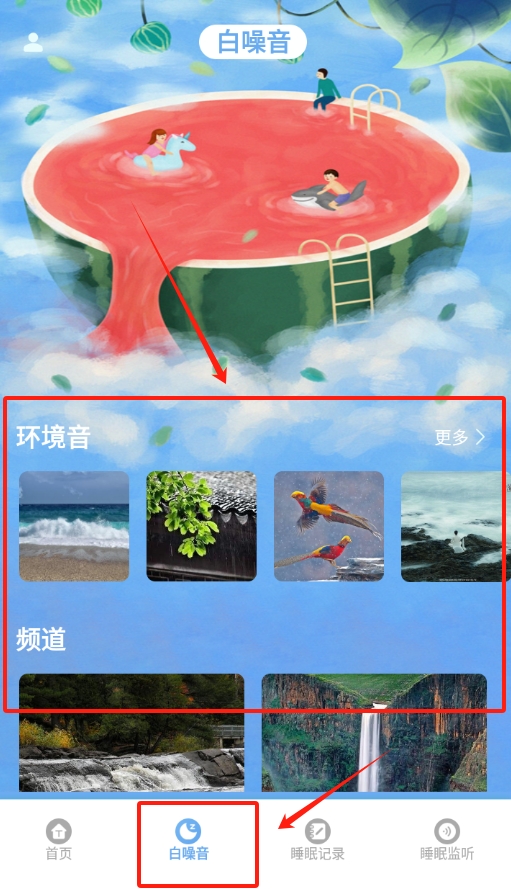 2、切换到白噪音页面,里面有多种白噪音可以选择,点击想听的白噪音就能播放,伴着声音能更轻松地进入睡眠状态。