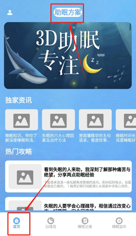 1、打开心晴度假村助眠后,首页能看到各种助眠方案的文章,想了解改善睡眠的方法,直接点击文章就能阅读学习很方便。