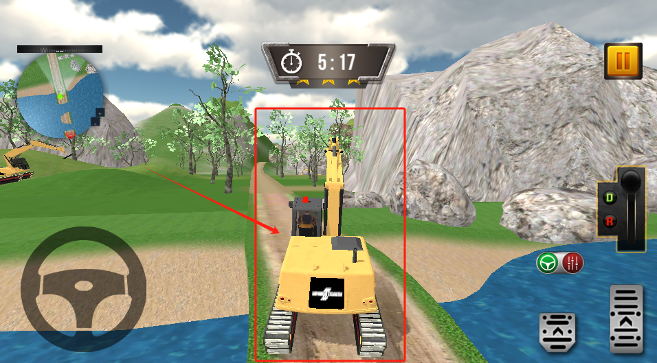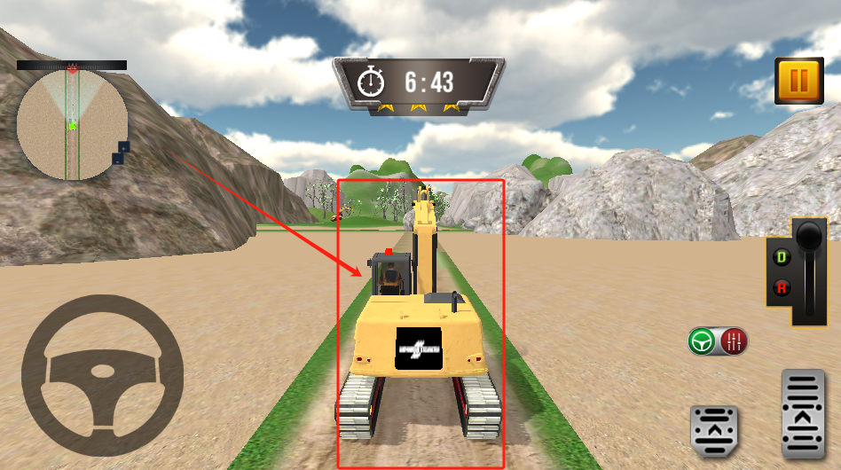 3、按方向键和旋转键操作黄色挖掘机,在土路和山石间完成挖掘任务。