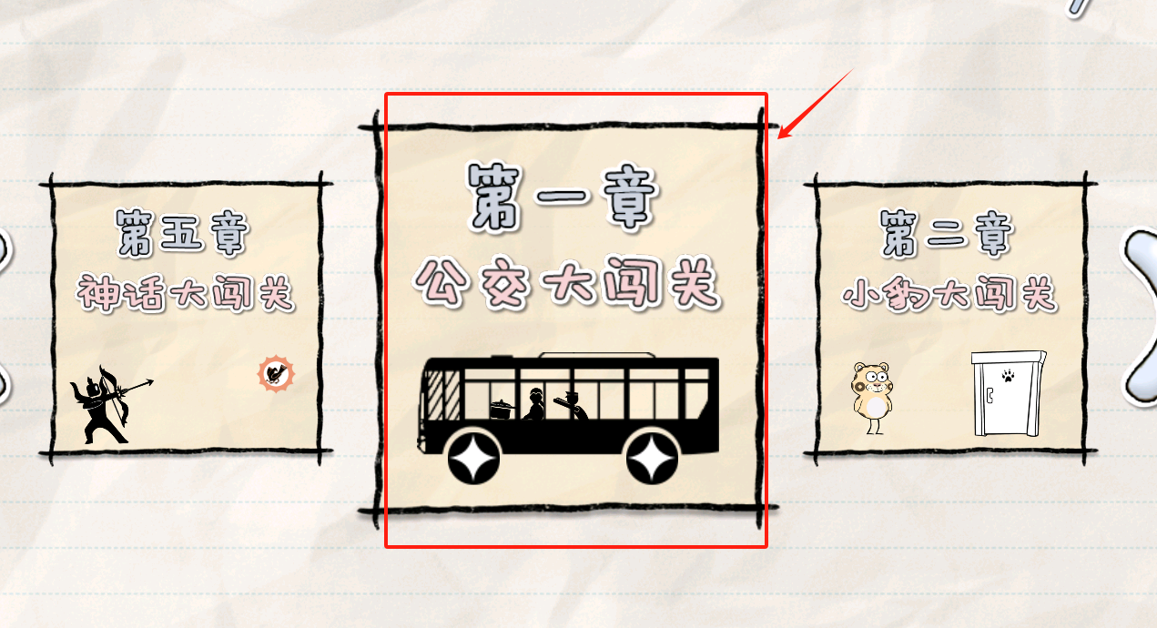 2、看到红框标注的第一章 公交大闯关,点中间那张带公交车的卡片,就能开始第一关挑战啦。