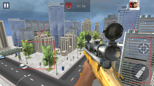 2、左侧是瞄准控制区域,右侧则是开镜与射击按钮,界面下方显示当前弹药与剩余敌人数量。