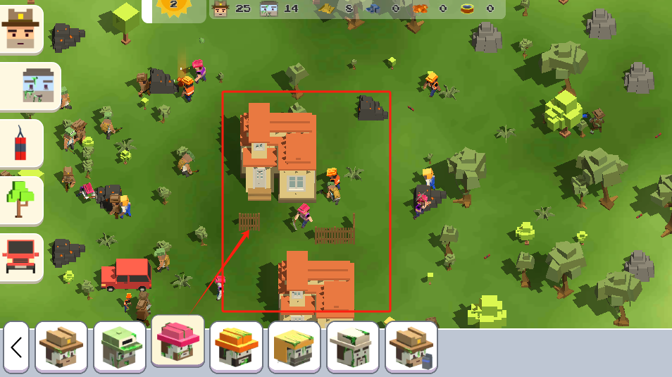 3、点击橙色房屋查看信息,草地上的僵尸和人物都能互动,注意资源数字变化。