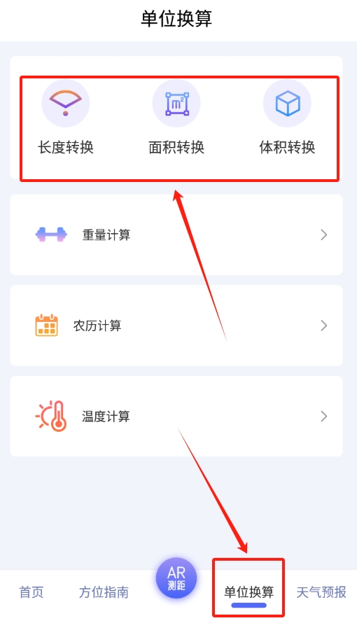 4、需要转换计量单位的话,打开单位换算页面,选择要转换的单位类型,输入数值就能自动转换,各种单位都能轻松搞定。