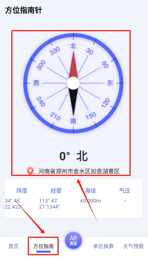 3、要是想查看指南针,在软件里找到方位指南页面点击进入,里面会清晰显示方位指向,户外出行时用着很实用。