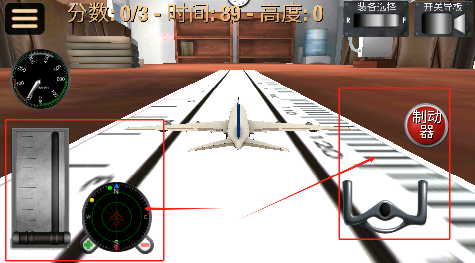 2、看仪表盘控制飞机速度,用制动器调整方向,注意右上角的时间分数。