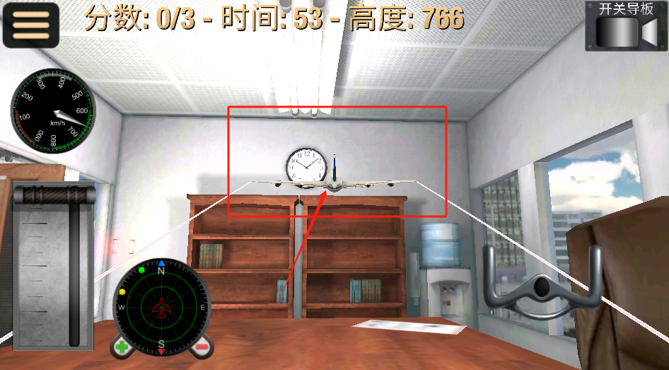 3、盯着指南针和高度表飞,按开关导板操作,墙上的时钟会提醒你时间。