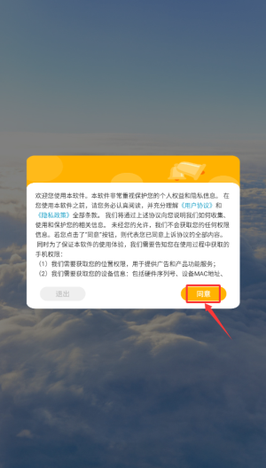 1、启动精准天气准时报APP后,首次使用需阅读并同意用户协议和隐私政策,点击确认进入主界面。