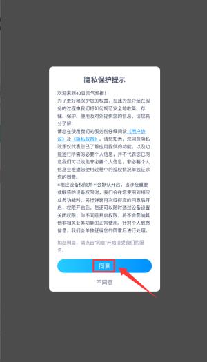 1、启动40日天气预报APP后,首次使用需阅读并同意用户协议和隐私政策,点击确认进入主界面。