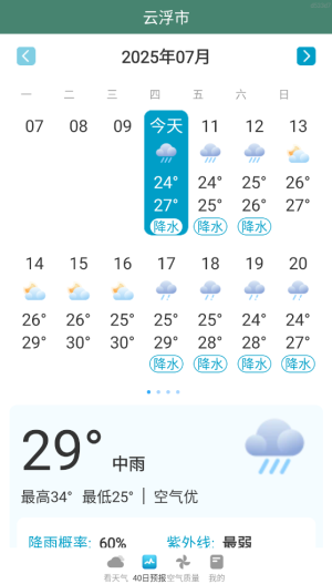 3、点击"40日预报"选项可查看长期天气趋势,包括温度变化和降水概率预测。
