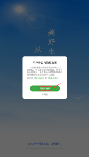 1、启动天气预报及时报APP后,首次使用需阅读并同意用户协议和隐私政策,点击确认进入主界面。
