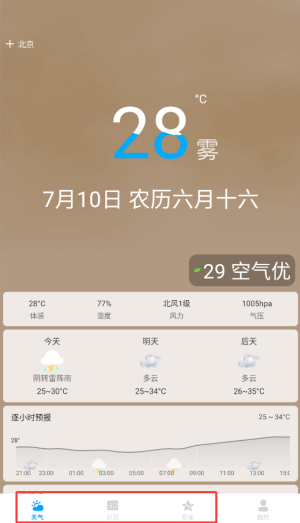 2、首页自动显示当前位置的实时温度、天气状况和湿度等基本气象数据。