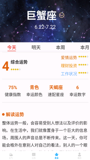 4、选择"星座"选项获取每日星座运势分析和相关天文知识介绍。