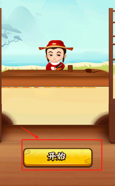 1、红帽小书生坐桌前,背景山水超好看,下方黄按钮写着开始,直接戳它进游戏别犹豫。