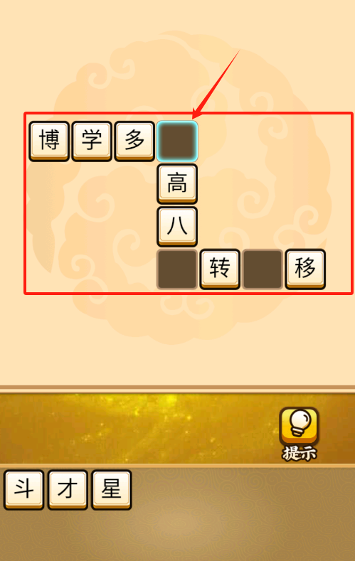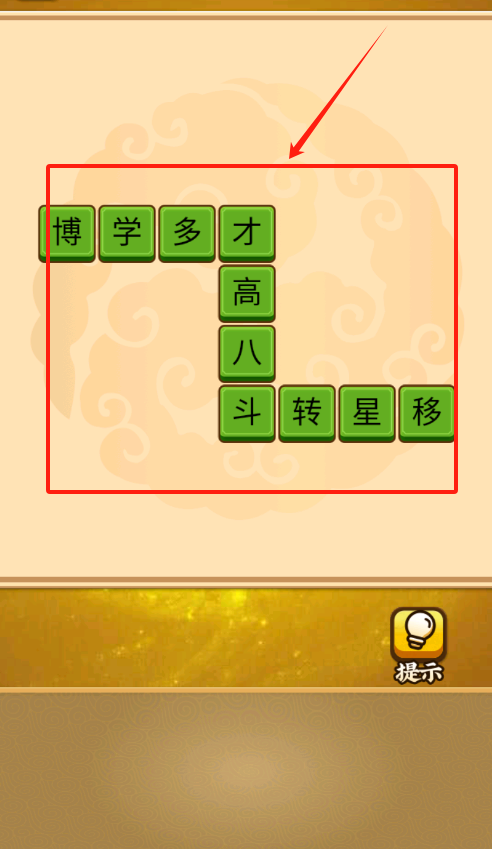 3、云纹背景红框框住成语方块,博学多才排最上,右下角黄灯泡正闪亮,不会就点提示别硬刚。