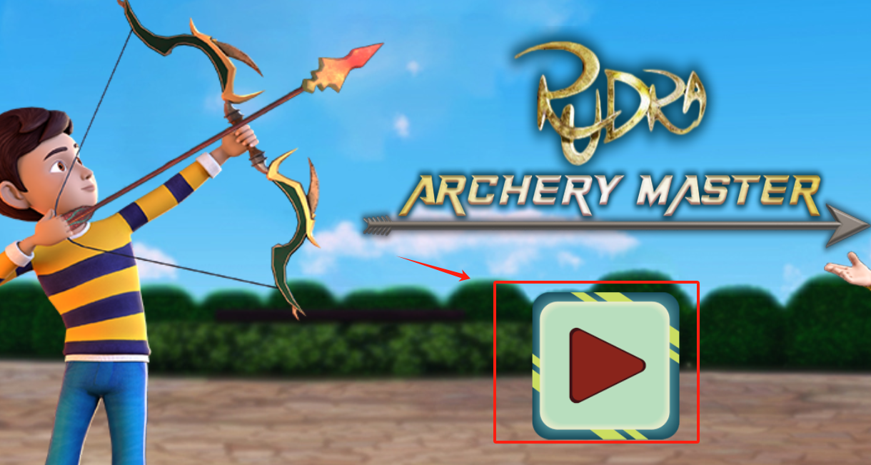 1、黄紫衣男孩拉弓瞄准,上方鲁德拉射箭大师金光闪闪,赶紧点右下角红按钮开始游戏。