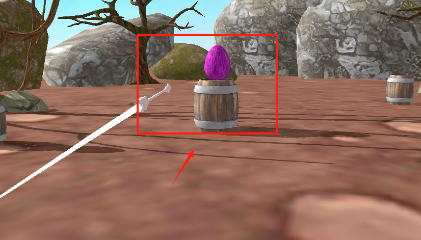 3、荒野木桶上紫蛋闪着光,石块枯树当背景,瞄准蛋的位置准备射击别手抖。