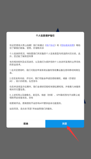 1、启动大箐山融媒APP后,首次使用需阅读并同意用户协议和隐私政策,点击确认进入主界面。