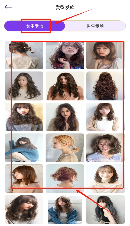 3、在发型库里找到女生专场,里面有很多好看的发型,各种风格都有,慢慢翻找总能找到喜欢的款式。