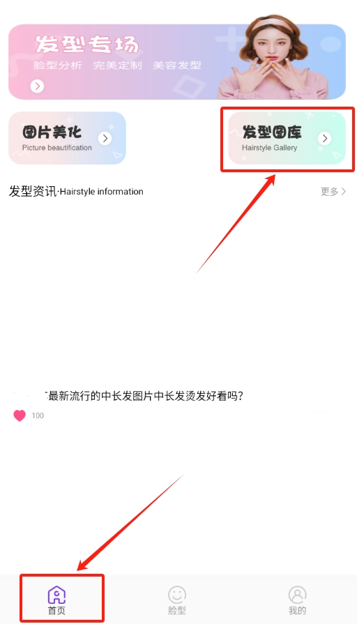 2、进入软件后,在首页上能看到发型库的选项,位置很明显,直接点击进去,就能浏览里面的各种发型了。