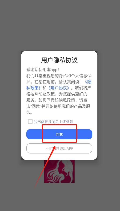 1、打开软件后,屏幕上会出现软件协议,大概看一下内容,点一下同意,这样才能继续使用软件的各项功能,很简单的一步。