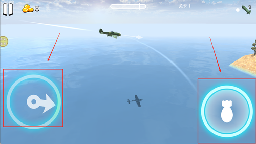 2、左侧控制飞机方向与俯仰角度,右侧为射击与切换武器按钮,滑动屏幕可调整视角观察周围环境。