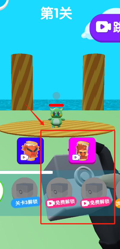 2、控制小恐龙跳过平台,右上角紫色按钮能跳过关卡,下方还能看广告解锁新角色。