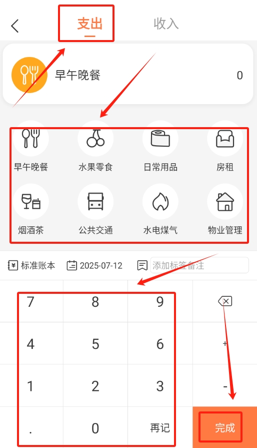 2、记账时输入金额,从海量标签中选择合适的,比如餐饮、交通等,添加备注后保存,3 秒完成。