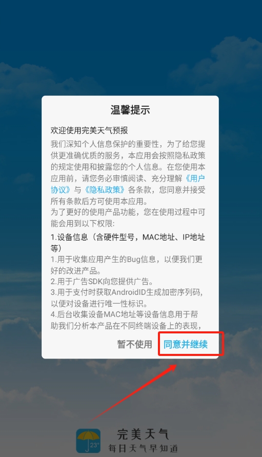 1、下载安装后打开,同意协议并允许定位,首页会显示当前城市的实时天气、温度、湿度等相关信息。