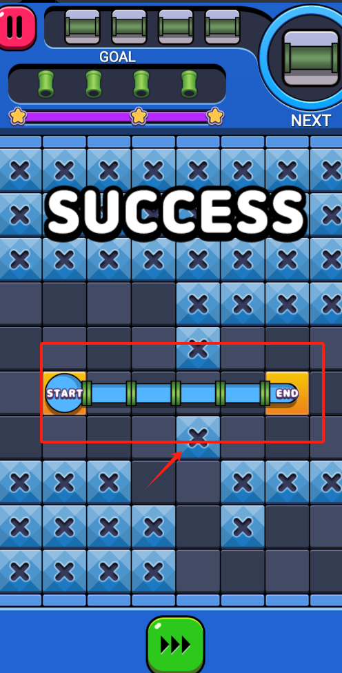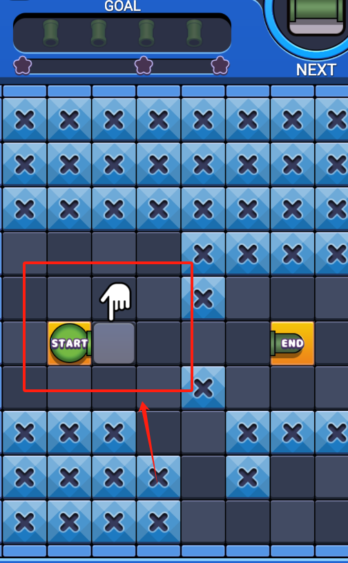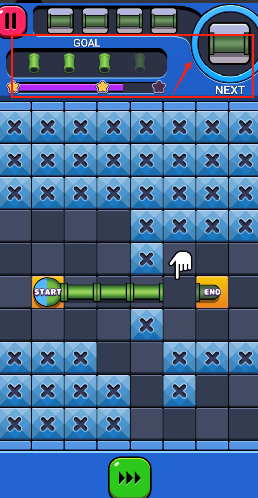 2、从START连绿色管道到END,避开蓝色叉号格子,看完红色箭头提示再动手。