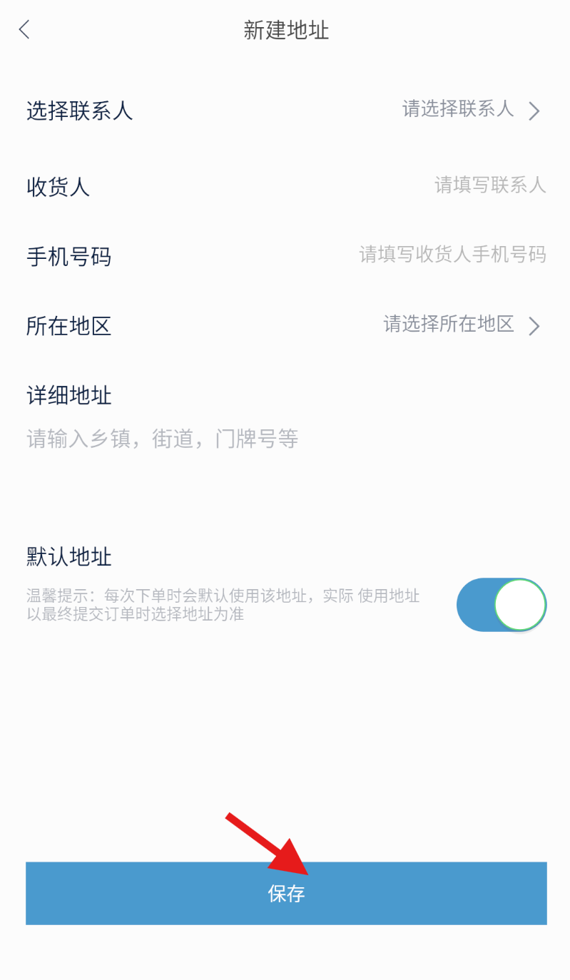 5、进入新建地址页面后,填写详细的地址信息,确认无误后点击保存,即可完成收货地址添加。