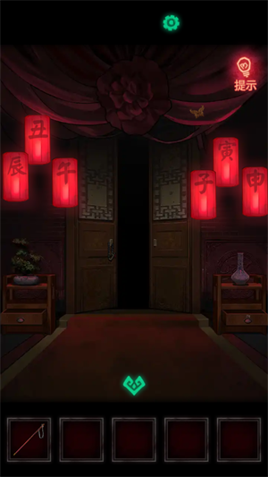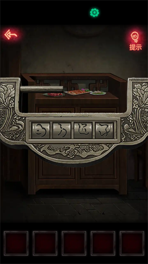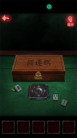 7、接着去麻将桌上,从左到右桌子上的麻将就是麻将桌上盒子的密码,然后再用盒子里的钥匙打开大门。先点花轿,拿到上面的钥匙。