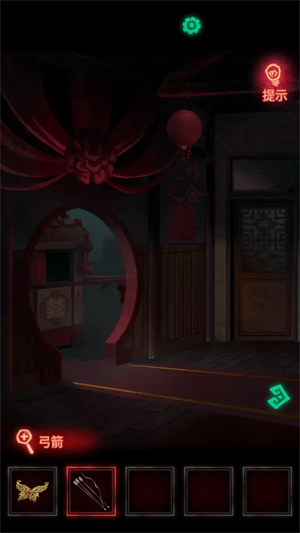 11、再去花轿的位置,用秤杆点那个红盖头,就可以获得弓和箭,再用弓箭射下花球,就又可以获得一个蝴蝶饰品。