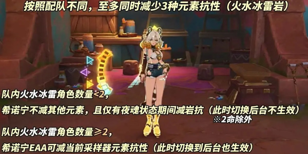 1、希诺宁持有的3枚采样器初始皆为岩元素,会按照配队情况转化为队友元素。所以这个形成了这个独特的玩法。