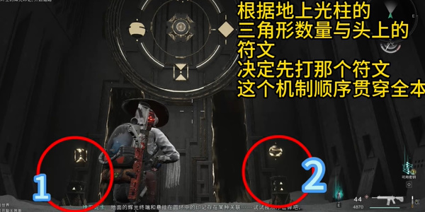 3、到达第一关,有三个光柱中间1,左边2,右边3击杀掉精英怪后拾取光球砸向光柱显现符号,根据顺序击碎上方圆盘。