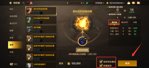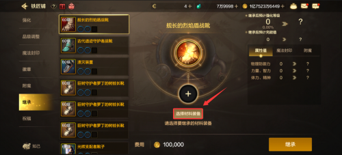 1、登录游戏后前往装备强化界面,选择"继承"功能并放入需要转移强化等级的主装备。