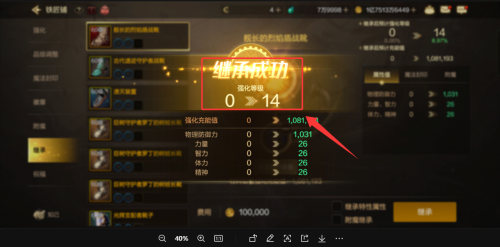 2、在材料装备栏放入提供强化等级的副装备,系统会自动显示可继承的强化属性数值。