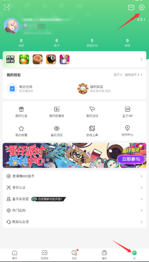 1、进入4399游戏盒APP后,点击底部"我的"选项,再选择右上角的设置按钮(位置如图所示)。