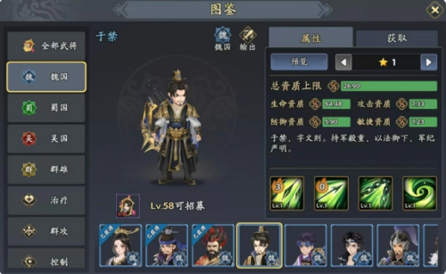 1、于禁隶属魏国,作为输出型武将,其必杀技四海八荒可对单一目标造成高伤害,并附加2%生命值的额外伤害,具追踪效果,降低敌方闪避。主动技能也能对敌方施加攻击降低状态,持续两回合,增强后续攻击机会。于禁依赖队友先行攻击,提升武力属性是强化输出的关键。