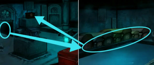 3、取下红箱子下面的毯子,并在左侧墓室用水湿润。然后用黑色钥匙打开中间的墓门,进入后把黑钥匙插入左上角石柱中心,水池排干后用湿毯清理池壁污垢。